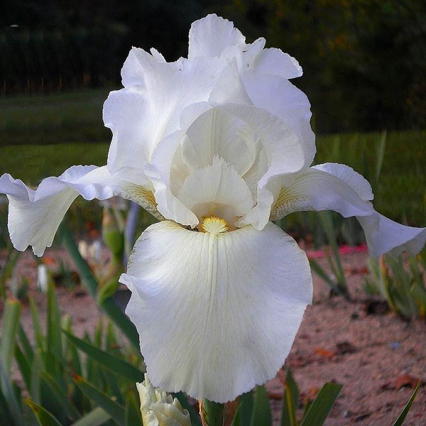 Ruffled pure white. Beards are white tipped yellow in center. Very reliable